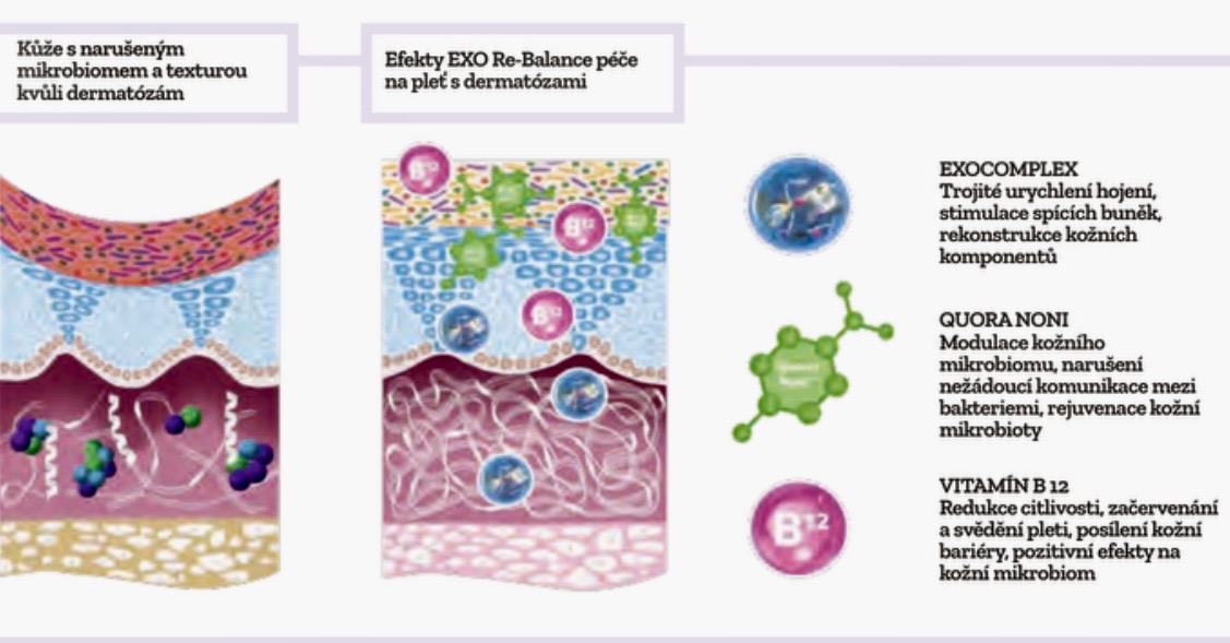 Začlenění exozomů do péče o problematické pokožky také využívá jejich potenciál známý z regenerativní medicíny. Exozomy jsou bohaté na růstové faktory a nukleové kyseliny a mají protizánětlivý účinek, který působí proti dopadům chronického zánětu spojeného s narušením mikrobiomu, jakož i proti průběhu dermatologických onemocnění a jejich léčbě. Změnou mikroprostředí postižené kůže exosomy aktivně regulují regenerační procesy, a tím usnadňují obnovení zdravého stavu kůže z patologického stavu. Jedním z nejdůležitějších aspektů jejich funkce je stimulace produkce růstových faktorů, což vede k trojnásobnému zrychlení hojivých a regeneračních procesů. To vede ke snížení zánětlivých reakcí spolu se snížením otoků a zarudnutí, účinně zmírňují riziko vzniku pooperačních jizev a zabarvení. Opravují také poškozenou kožní bariéru a struktury a podporují všechny profesionální ošetření náročných kožních stavů s dermatózami. To je obzvláště důležité, když stávající kožní léze omezují použitelnost intenzivních ošetření a onemocnění vede k urychlenému stárnutí kůže, pooperační hyperpigmentaci nebo jizvení. Řešením v tomto případě je inovativní kombinace exozomů s látkami, které regulují mikrobiom.